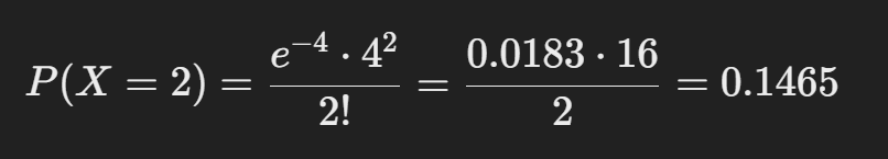 예를 들어, 병원 응급실에 평균적으로 한 시간에 4명이 방문한다고 하자. 한 시간 동안 2명의 환자가 방문할 확률을 구해보면