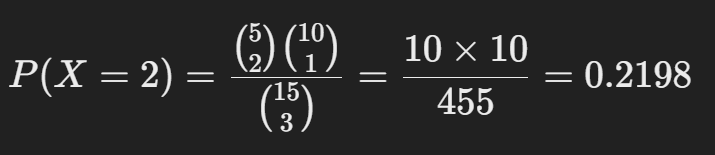 예를 들어, 상자에 검은 공 5개와 흰 공 10개가 있는 상황에서, 3개의 공을 뽑았을 때 검은 공 2개가 나올 확률을 구해보자