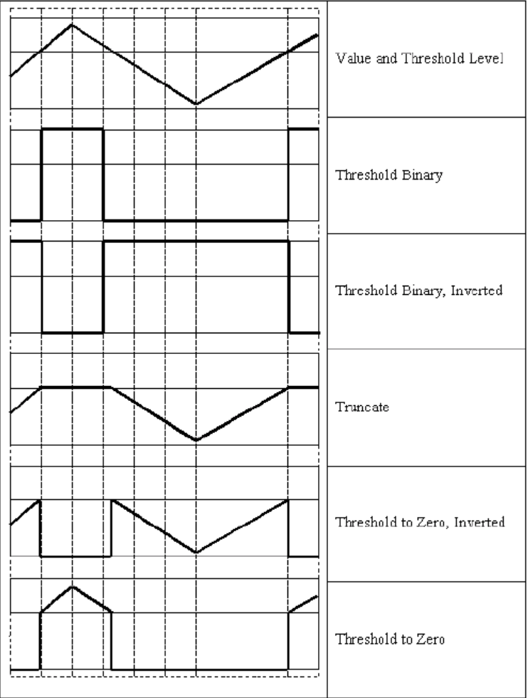 이건 Threshold Operation(임계값 처리)의 여러 종류를 시각적으로 보여주는 그래프다.