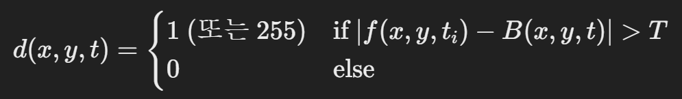 여기서 T는 차이를 감지하는 임계값이고, 차이가 크면 1 또는 255로 표시된다.