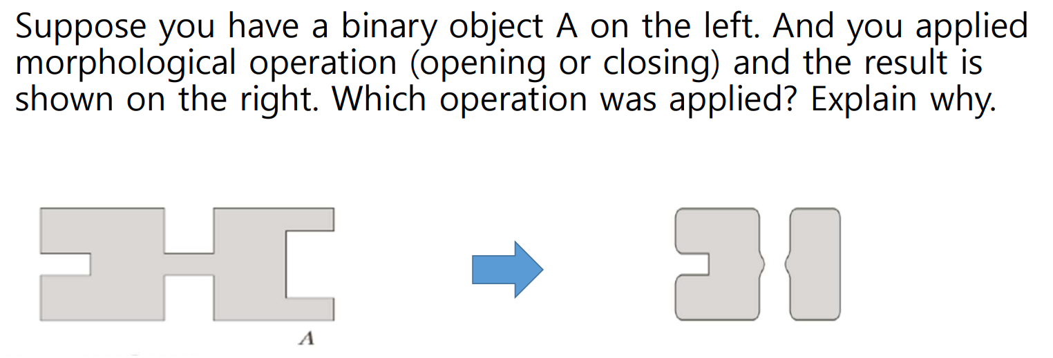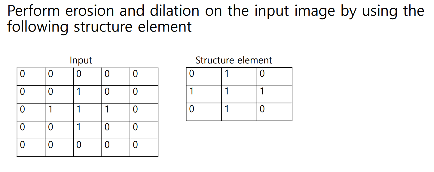 구조화 요소와 모든 1이 일치하는 영역이 있으면 그 중심 픽셀은 1로 유지되고, 그렇지 않으면 0이 되는 거다