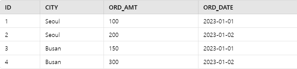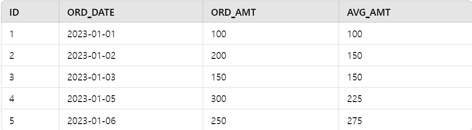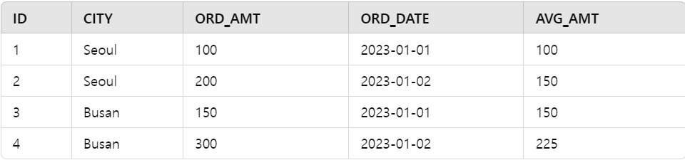 아이디가 2인 서울은 아이디가 1번인 서울 행이 PRECEDING 행이므로 이 둘의 ORD_AMT 평균이 아이디가 2인 서울의 AVG_AMT가 된다.