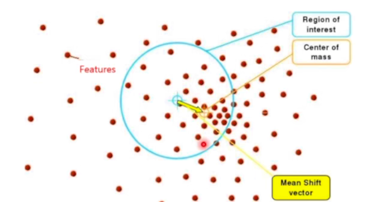 - 현재 원 안에 있는 모든 점들의 평균 위치(Center of Mass)를 계산한다.