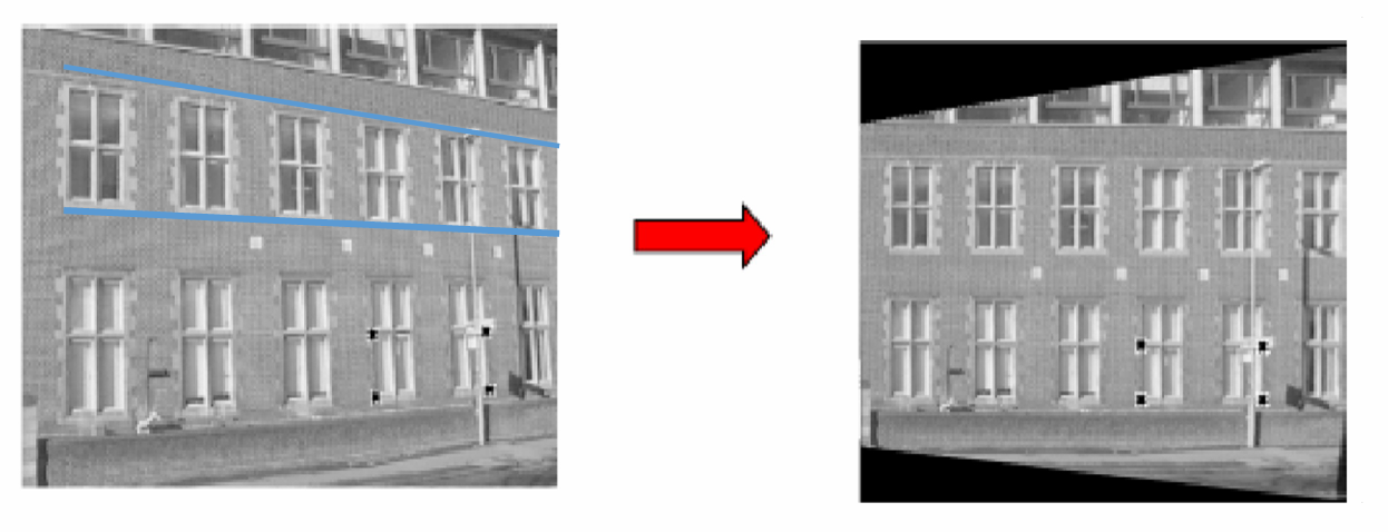 - 투영 변환 적용: 이제 계산된 변환 행렬을 이미지에 적용하면 된다. 그럼 오른쪽 이미지처럼 건물이 평평하게 보이게 된다! 왜곡이 사라지고, 마치 정면에서 찍은 것처럼 보정된 모습이 된다.