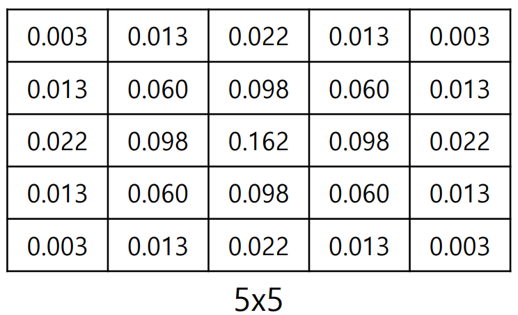 중심 값이 0.162로 가장 크고, 주변으로 갈수록 가중치가 줄어든다.