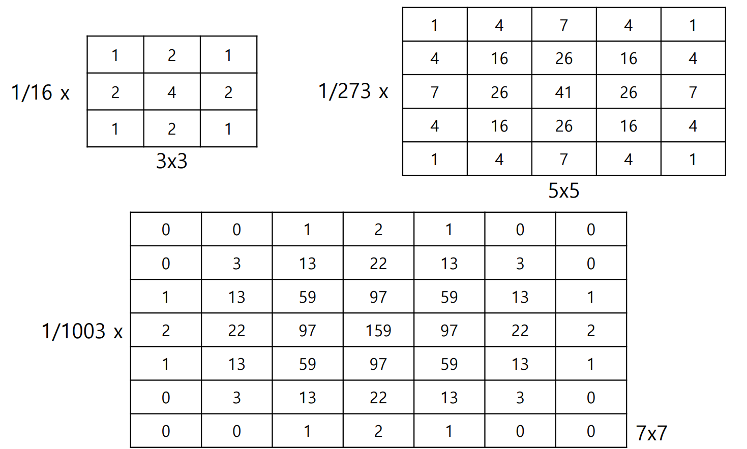 3x3, 5x5, 7x7 가우시안 커널들은 가우시안 필터의 크기와 σ=1인 경우를 보여주고 있다.