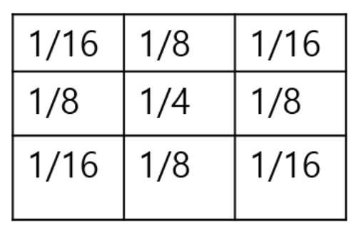 필터의 중심에는 가장 큰 가중치인 1/4가 있고, 주변으로 갈수록 가중치가 줄어들어 1/16이 된다.