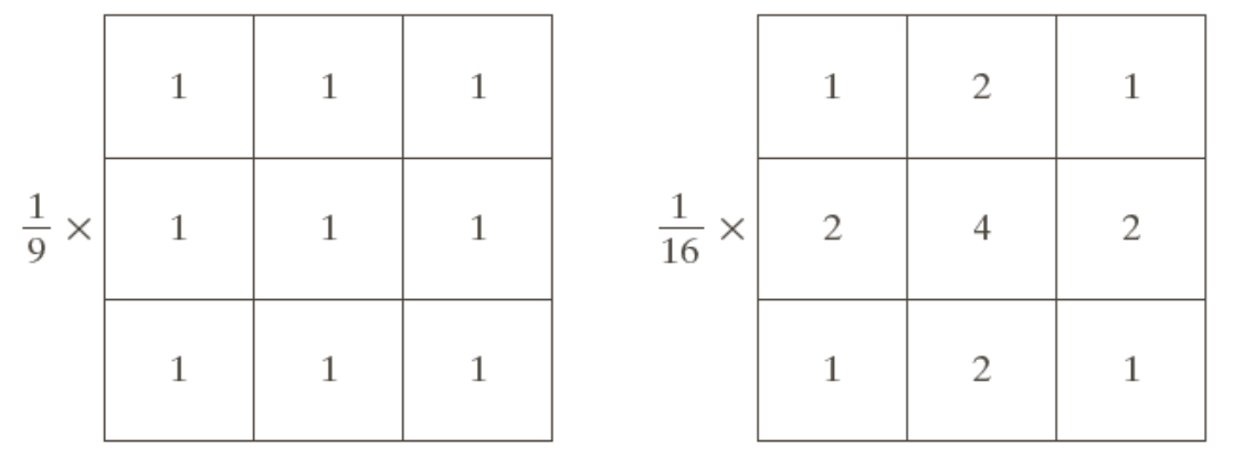 이 커널은 3x3 크기의 작은 가우시안 필터를 나타낸다. 표준편차(σ)가 1인 경우로, 중심에 가까운 픽셀에 더 큰 가중치를 주고 있다.