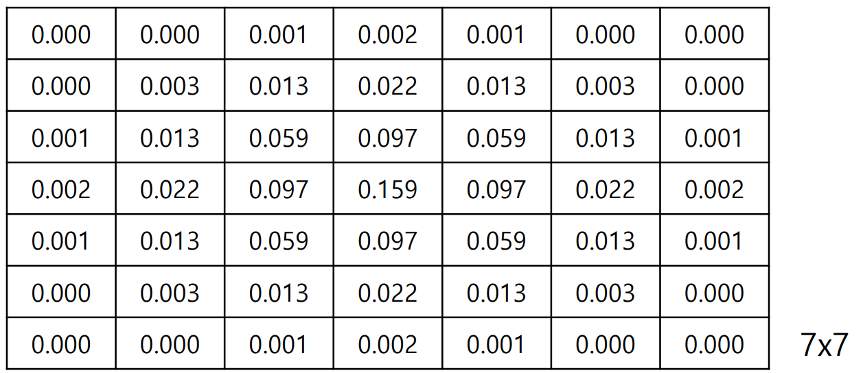 이 행렬은 필터의 크기와 표준편차(σ, 시그마)에 따라 결정된다.